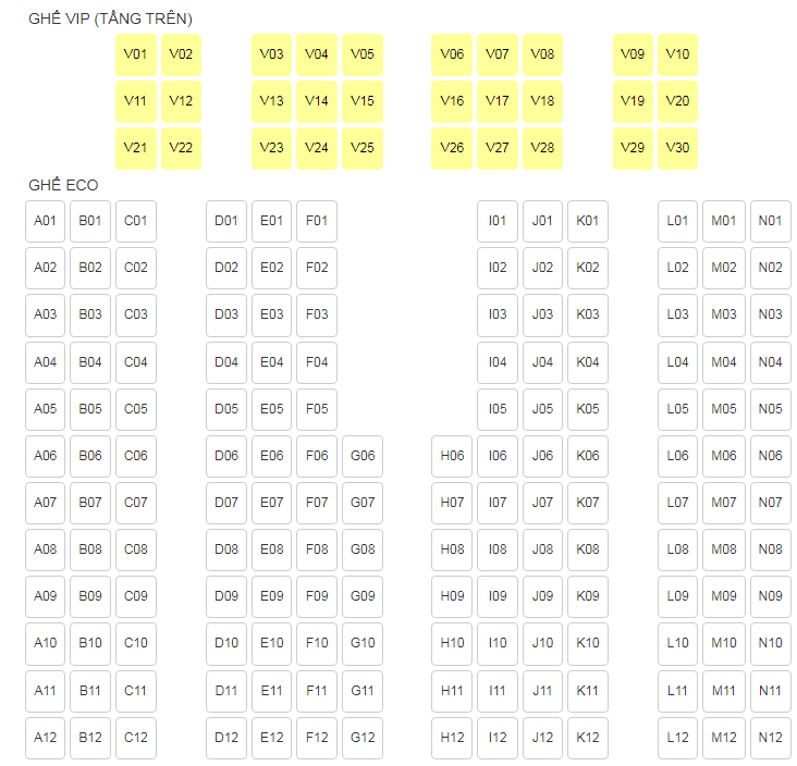 - Ghế VIP màu vàng: 30 ghế (nằm tại khoang riêng biệt ở tầng trên, ghế có khả năng ngả 130 độ, trang bị màn hình giải trí riêng).